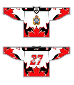 • CFB Kingston Jersey (Canadian Military), Flags, Round Yoke, v-neck (J0), style 221, Nashville Numbers Maple graphics (RJS508), white, red, black, gold Fully Custom Sublimated Hockey Jerseys by Magnum
