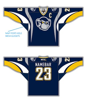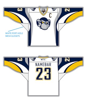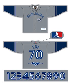 Grey, blue, fake buttons, Mission sponsored Mississauga Rattlers